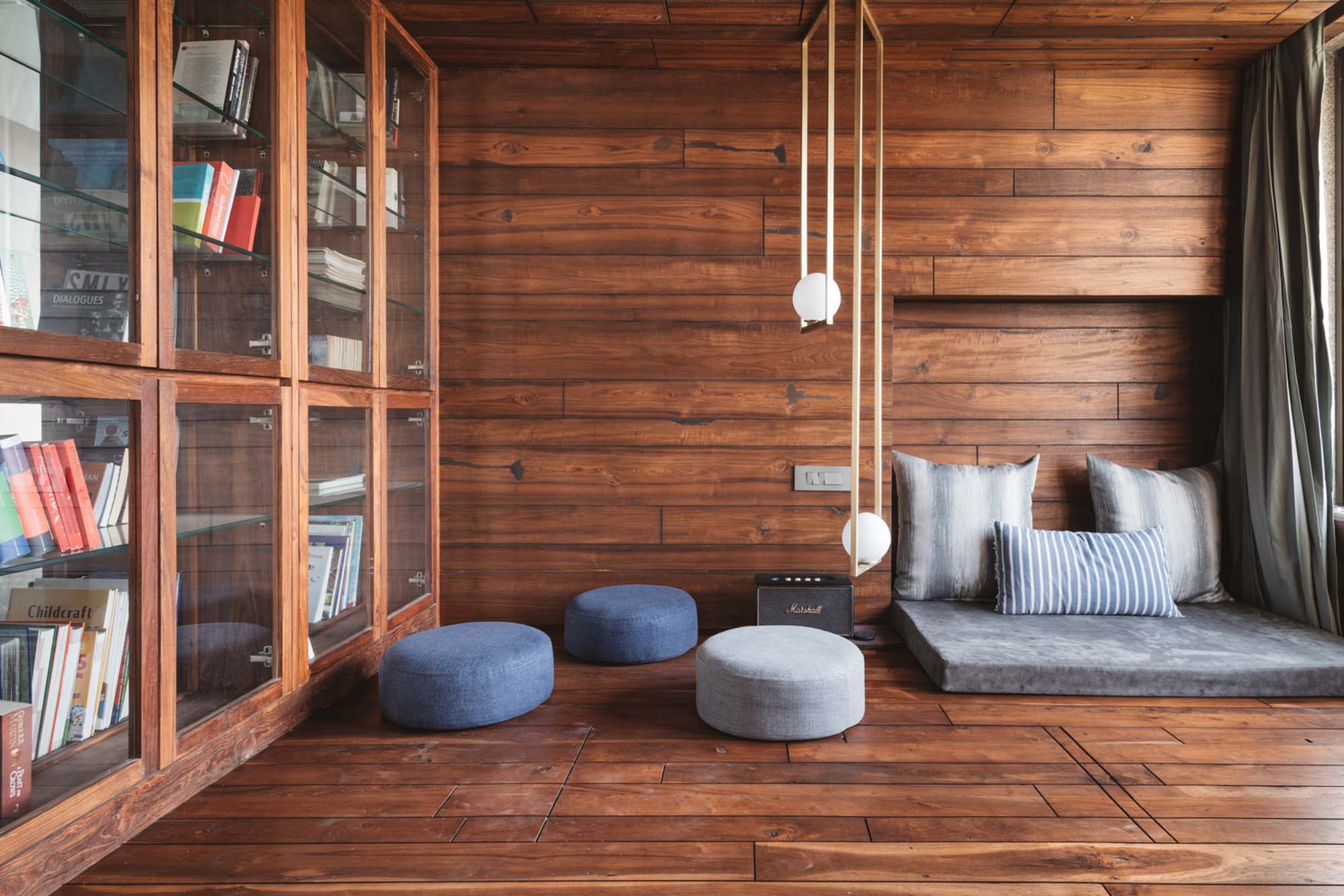 書房的內裝主要是使用來自於艾哈邁達巴德的傳統房屋群(Pols)中,具有將近一世紀歷史的Valsad柚木回收。由於它被分配到的坪數空間較小,因此室內設計師設計了幾階台階,製造出高低差降低進入小空間會有的壓迫感;將書房空間徹底獨立出來,在進入書房空間時進而有種由大空間進入私密區域的感覺。