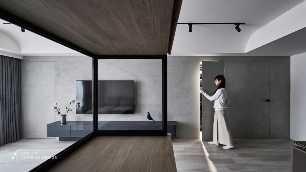 從客廳沙發區看到有人拉開灰色特殊漆隱藏的浴室門